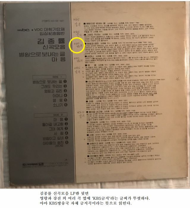 오늘 이 글을 쓰면서 놀라운 사진 두 장을 공개한다. 위에서 말한 방송 부적절 곡에 대한 내용을 뒷받침하는 자료이다. 최근 인터넷에 떠다니는 사진을 우연히 발견했는데 이게 기막힌 사진이다. 아마 KBS창원 총국에서 나온 LP를 누군가 판매를 위해 사진 찍어 올렸는데 이게 내 눈에 들어 왔다.