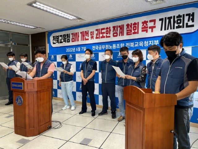 전국공무원노동조합 전북교육청지부(이하 전공노 교육청지부)는 지난해 완주교육지원청 회계사고와 관련해 주변 관계자들까지 징계처분이 내려졌다면서 과도한 징계를 철회하라고 촉구했다.
