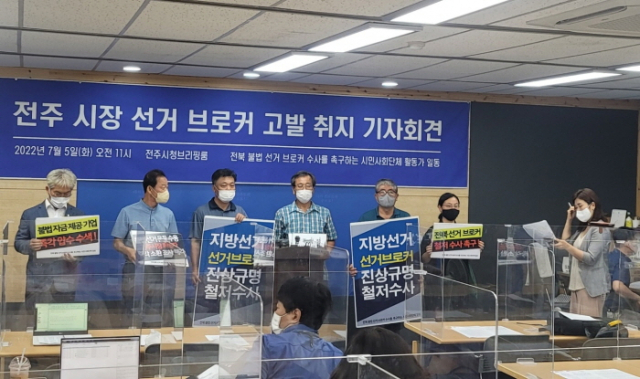 이들 시민단체 활동가들은 이날 전주시청에서 기자회견을 열고 "지난 4월 더불어민주당 전주시장 예비후보인 이중선 후보를 통해 공개된 선거 브로커 사건은 세간에 들려오던 우리 지역사회의 대형 의혹들의 실체를 일부 드러냈지만 수사는 미진하다"고 비판했다.