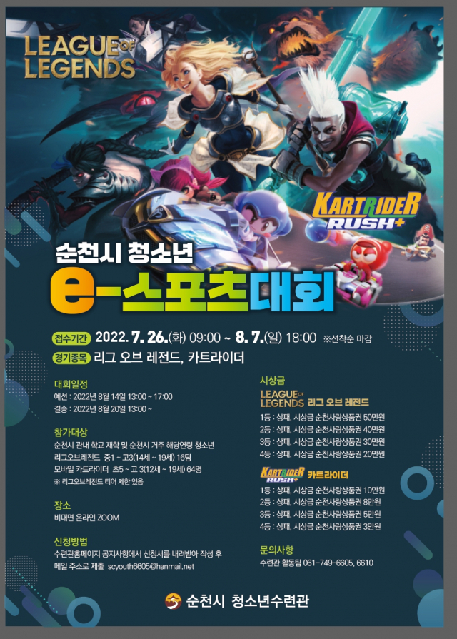 청소년 e스포츠대회 참가신청 등 기타 자세한 사항은 순천시 청소년수련관으로 문의하면 안내받을 수 있다.