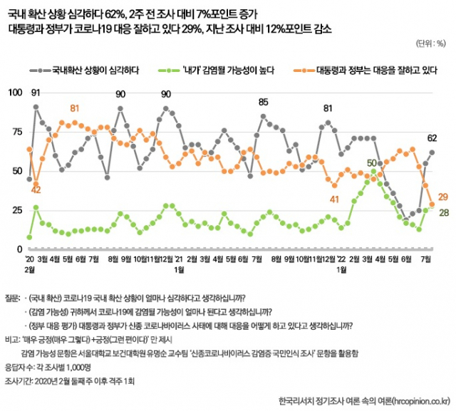 반면 '대통령과 정부가 코로나19 대응을 못한다'는 응답률은 62%를 기록해 역대 최고치를 기록했다. 델타 유행 당시인 2021년 12월 마지막 조사에서 해당 응답률이 55%까지 오르긴 했으나 이번 응답 수준보다는 낮았다.