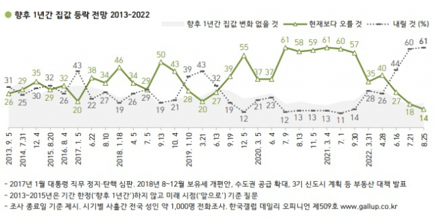 26일 한국갤럽이 전국의 성인 1001명에게 앞으로 1년간 집값 전망을 물은 결과, 응답자의 61%가 '내릴 것'이라고 답했다.
