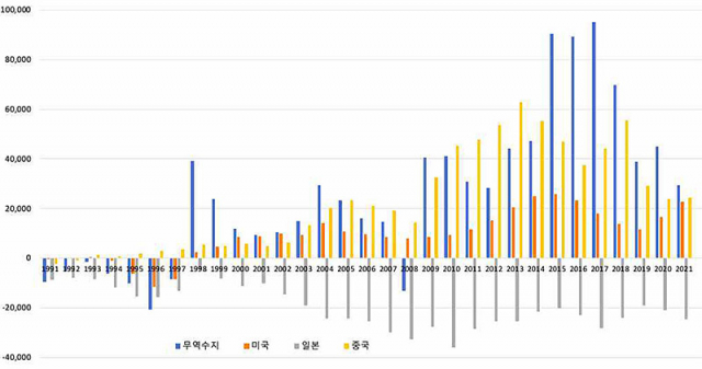 아래 도표는 한국의 대외무역 수지와, 대미국, 대일본, 대중국과의 무역수지를 나타낸다. 우리나라는 중국과 수교를 맺은 첫 해인 1992년을 제외하고 1993년부터 2021년까지 중국과의 무역에서 흑자를 기록했다. 2008년 미국발 글로벌 금융위기 여파로 무역수지 적자를 기록했음에도 대중국 무역수지는 흑자를 달성했다.