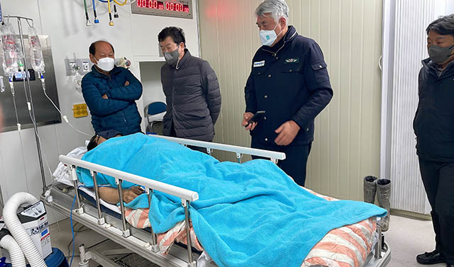 ▲지난 5일 오전 2시께 경북 안동병원을 방문한 최승준(오른쪽 두 번째) 정선군수와 배왕섭(오른쪽) 군의회 부의장 등이 봉화광산에서 극적으로 구조된 뒤 병원으로 이성되어 치료 받고 있는 박씨와 가족들을 위문하고 있다. ⓒ정선군