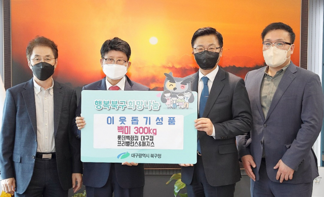롯데백화점 대구점은 대구 향토 패션 기업 '프리앤메지스(대표 김광배)'와 함께11월 11일 대구 북구청을 찾아 지역의 어려운 이웃들을 위해 백미 300kg을 나눔했다.