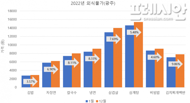 5일 한국소비자원의 외식비 가격동향에 따르면 지난해 12월 광주의 대표 외식품목 8개의 평균 가격이 지난해 1월 대비 6.82% 상승했고 전남지역은 9.34% 올랐다.