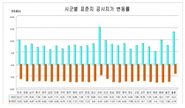 도내 시․군․구별 변동률은 예천군이 7.4%로 가장 많이 하락했고, 영양(7.34%), 봉화(7.32%), 문경(7.22%) 순으로 공시가격 현실화 수정계획에 따른 현실화율 조정이 가장 큰 하락요인으로 작용했다.