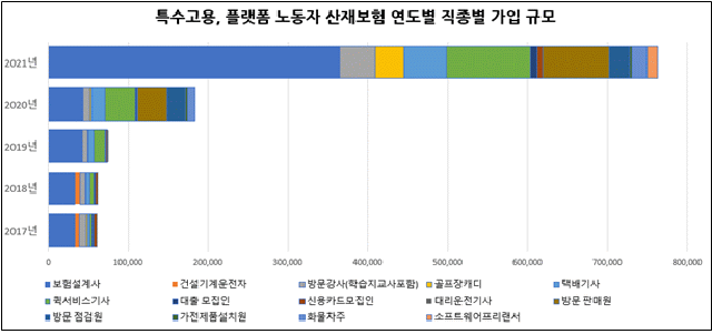 이게 얼마나 큰 장애물이었는지는 특수고용 산재보험 가입자 수의 변화를 보면 쉽게 알 수 있다. 적용제외신청 제도가 사실상 폐지된 2021년, 산재보험 가입자 규모가 18.3만 명에서 76.2만 명으로 전년(2020년) 대비 무려 4배로 치솟게 된다. 특히 보험설계사·방문강사·골프장캐디·택배기사·퀵서비스기사 가입 규모가 급증했음을 확인할 수 있다.