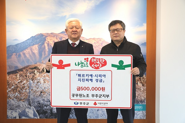 전국공무원노동조합 무주군지부가 지진으로 어려움을 겪고 있는 튀르키예 · 시리아 국민들을 위한 성금을 기탁해 귀감이 되고 있다고 밝혔다.