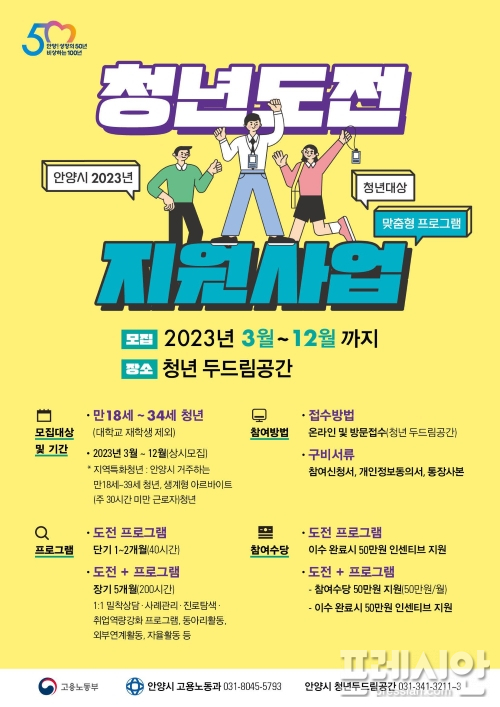 참여 희망자는 오는 3월 2일부터 워크넷(work.go.kr/youngChallenge/index.do)에서 신청하거나 관양동에 있는 청년두드림공간에 방문해 신청하면 된다.