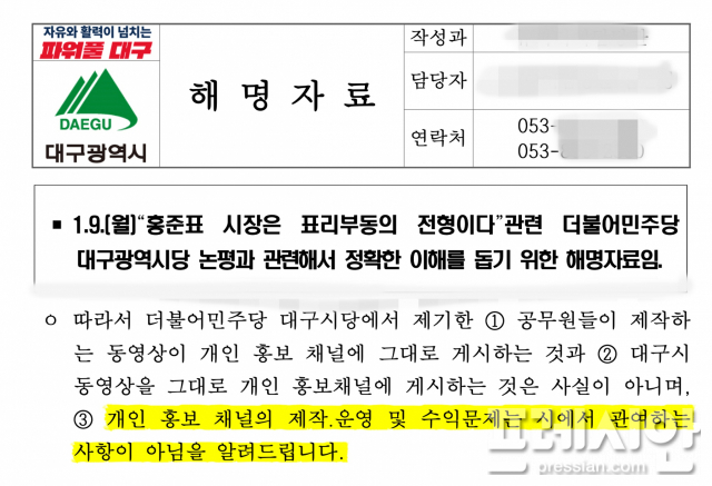 논란이 커지자 대구시는 지난 1월 각 언론사에 자료를 배포하며 "대구시 웹하드와 시정뉴스에 게재된 영상은 언론사를 비롯한 시민 누구나 사용할 수 있다"라며 "개인홍보 채널의 제작·운영 및 수익문제는 시에서 관여하는 사항이 아님을 알려드립니다"고 적극 해명했다.