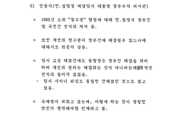대사관은 1991년 8월 일본 수도 도쿄에서 개최된 '아시아·태평양 지역 전후 보상 국제 포럼'의 참석자들 발언을 대외비 문서로 작성해 본부에 보고했다. 이에 따르면 민 전 수석은 포럼에서 "1965년 소위 청구권 협정에 대해 한일 양국 정부 간 및 국민 간 인식의 차가 크고, 개인의 청구권이 정부 간에 해결될 수 있느냐에 대해서도 의문이 남는다"고 말했다.
