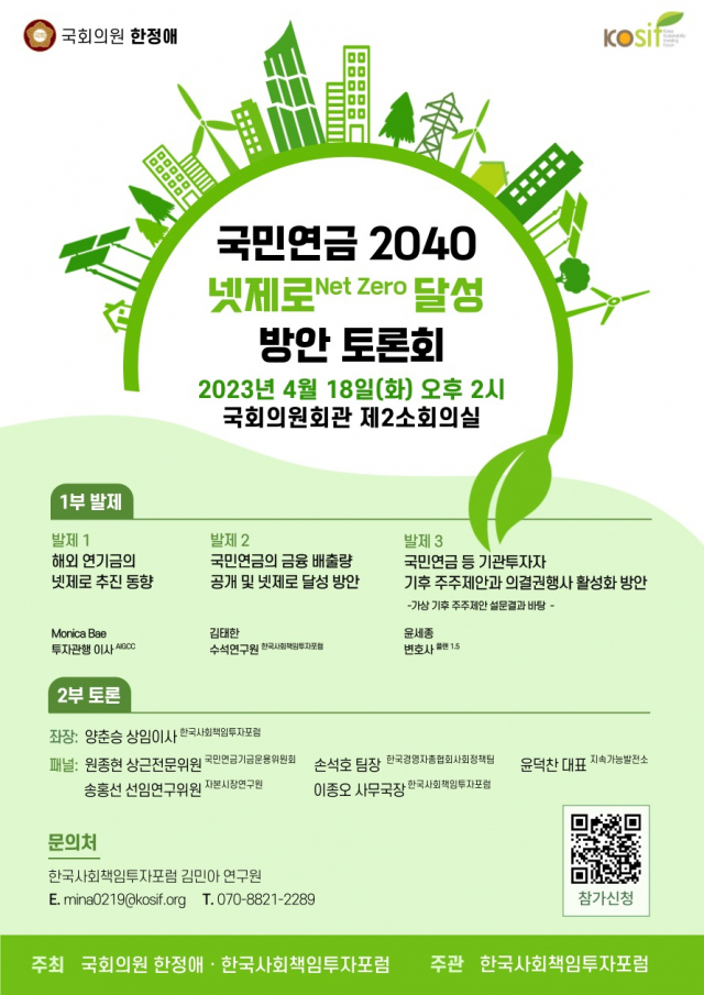 한국사회책임투자포럼(이사장 김영호)과 한정애 국회의원은 오는 4월 18일(화) 오후 2시 국회의원회관 제2소회의실에서 이같은 내용을 골자로 한 '국민연금 2040 넷제로 달성 방안 토론회'를 공동으로 개최한다고 밝혔다.