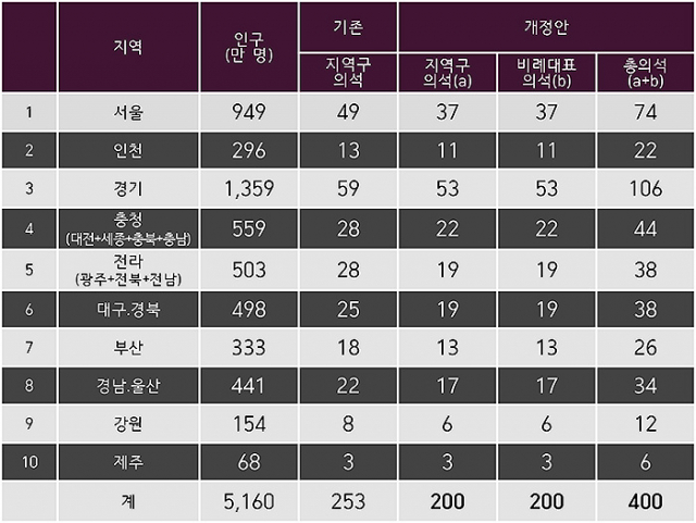 <표 2>는 비례대표 의석수를 30석 늘려 총 330석으로 하고, 지역구는 현행대로 253석, 비례대표는 77석으로 했을 때의 권역별 의석수이다.