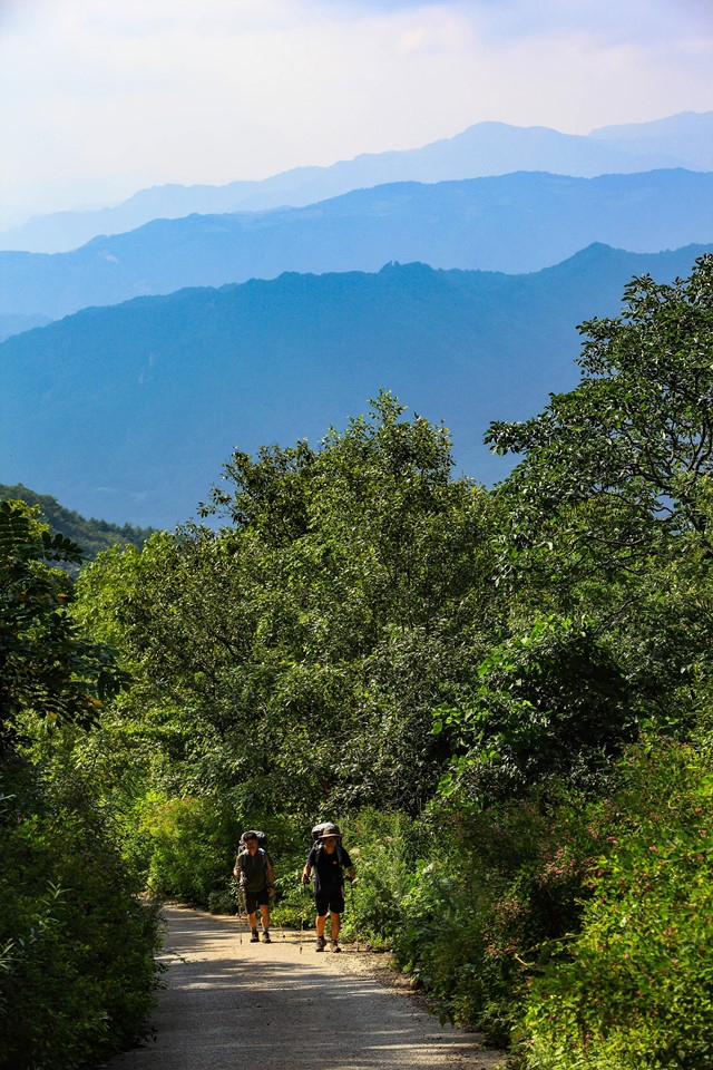 ▲방동약수에서 아침가리골로 넘어가는 길. 뒤로 강원도 산들이 너울지며 수묵화를 펼쳤다.Ⓒ이승태