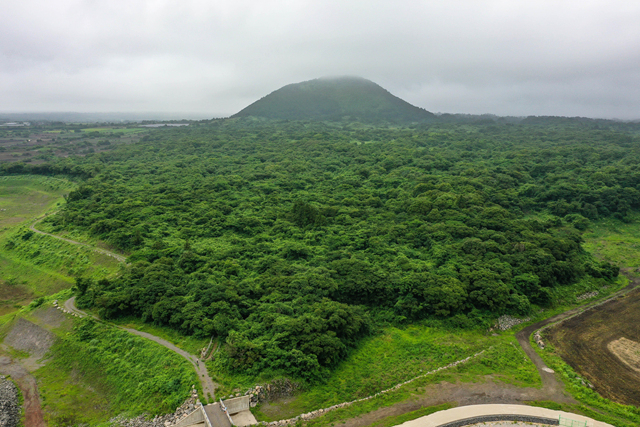 ▲공중에서 본 송당곶자왈. 둔지봉에서 용암이 흘러내린 너른 지역을 따라 곶자왈이 발달했다.Ⓒ이승태