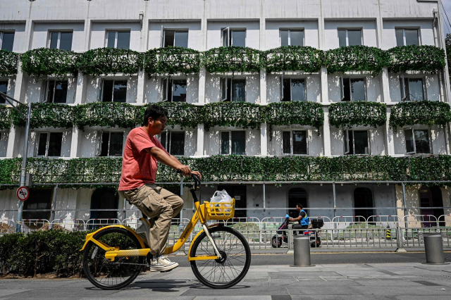 ▲지난 15일 중국 베이징의 한 쇼핑몰앞을 자전거를 탄 시민이 지나가고 있다. ⓒAFP=연합
