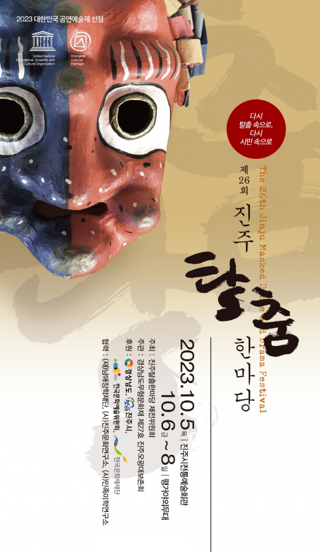 "진주오광대는 진주 지방에서 전승되어온 탈춤이며, 현재 경상남도 무형문화재 제27호로 지정되어 있습니다. 진주오광대는 일제강점기에 중단되었다가 1998년 60년만에 복원에 성공하였습니다.