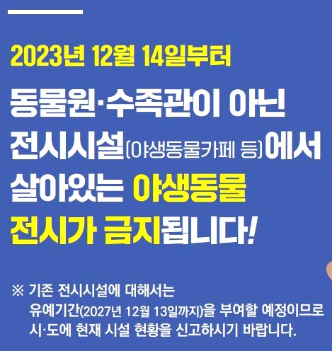 이에 따라 지난해 12월13일 야생생물법 개정 공포 당시 영업하고 있던 기존 전시자는 오는 13일까지 야생동물 전시시설의 소재지, 보유 동물 종·개체수 등 현황을 시에 신고할 경우 신고한 동물에 한해 2027년 12월13일까지 전시금지가 유예된다.