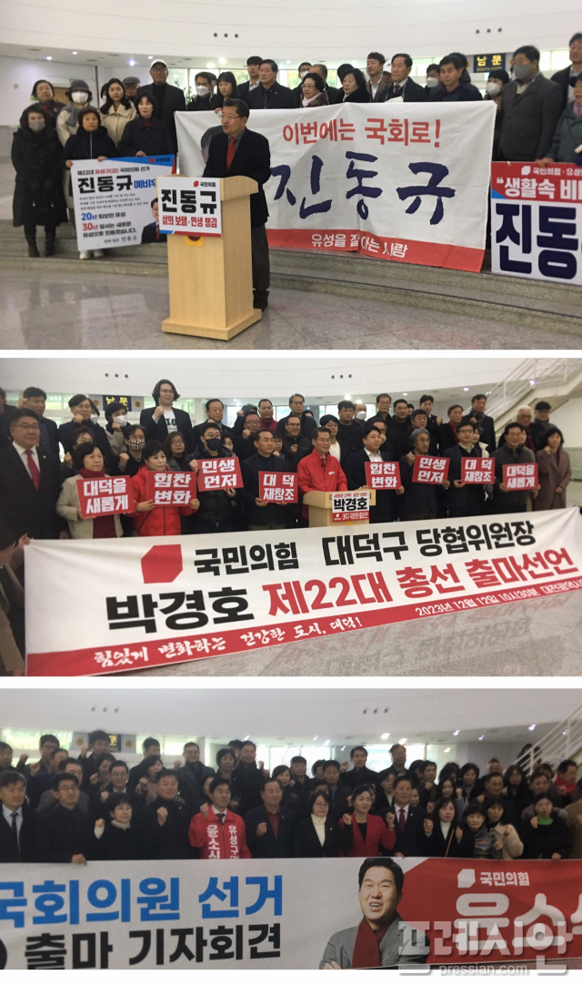 이날 국민의힘 진동규(전 대전 유성구청장) 예비후보는 유성갑, 박경호(국민의힘 대전 대덕구 당협위원장) 예비후보는 대덕구, 윤소식(전 대전경찰청장) 예비후보는 유성갑 출마를 공식 선언했다.