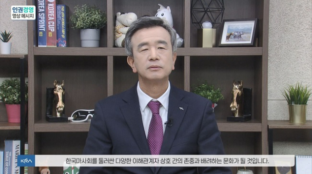 정 회장은 영상을 통해 “‘글로벌 TOP 5 말산업 선도기업’이라는 비전을 위해 사회적 책무를 다할 것”이라며 “이를 위한 원동력은 국민, 말산업 관계자 및 협력업체 등 한국마사회를 둘러싼 이해관계자간의 상호존중 및 배려하는 문화”라고 강조했다.