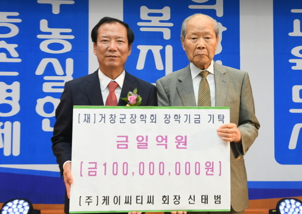 경남 거창군 위천면 황산마을 출신 ㈜케이씨티씨 신태범 회장이 (재)거창군장학회(이사장 구인모)에 장학금 1억 원을 기탁했다.