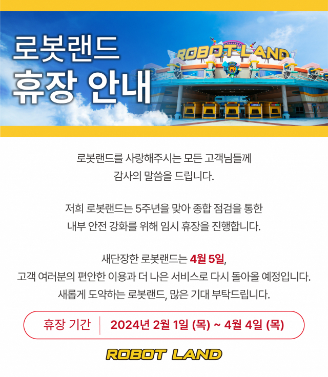 로봇랜드는 개장한 지 4년간 별다른 사고가 없이 운영하여 왔고, 향후에도 로봇랜드를 찾는 고객들이 쾌적하고 안전하게 이용할 수 있도록 선제적으로 임시 휴장을 통해 전체 시설을 점검할 계획이다.