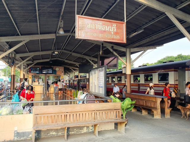 방콕에서 출발하는 칸차나부리행 열차는 방콕 중심에서 짜오프라야 강 건너 서쪽에 자리 잡고 있는 톤부리 역에서 출발한다. 기차를 타고 방콕에서 칸차나부리까지 가기 위해서는 오전과 오후 하루 두 편 있는 남톡행 열차를 타야 한다. 오전 열차는 7시 45분 출발이라 숙소를 역 인근에 잡아 아침 번잡한 시간을 절약했다. 톤부리 역은 시장을 끼고 있다. 시장 특유의 활기가 이른 아침부터 사람들에게 생기를 불어넣는 듯했다. 매표소에서 콰이강의 다리 역까지 가는 표를 끊었다. 열차 값은 100바트이다. 특이한 점은 현지인들은 거리별로 다른 요금을 내는데 외국인은 한 정거장을 가든 종착역까지 가든 100바트를 내야 한다. 한화로는 환율 변동에 따라 다르지만 약 3,800원 정도 한다. 여행자들은 역 앞 시장에서 아침 식사용 도시락을 사기도 한다. 볶음밥 위에 제법 큰 닭 튀김과 약간의 야채를 얹은 도시락이 20바트, 800원이 채 안 되는 가격이다. 내가 표를 사는 동안 일행들은 도시락 4개에 50바트를 더주고 과일 2팩을 샀다. 저렴한 시장 물가 덕분에 기분 좋게 조식을 챙겨 열차에 올랐다.
