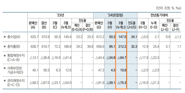 이에 따라 국세 총수입에서 총지출을 뺀 통합재정수지는 1분기말 현재 64조7000억 원 적자가 됐다. 통합재정수지에서 국민연금, 고용보험 등 사회보장성기금수지 10조6000억 원 흑자를 제외한 실질 나라 살림인 관리재정수지는 1분기 75조3000억 원 적자가 됐다.
