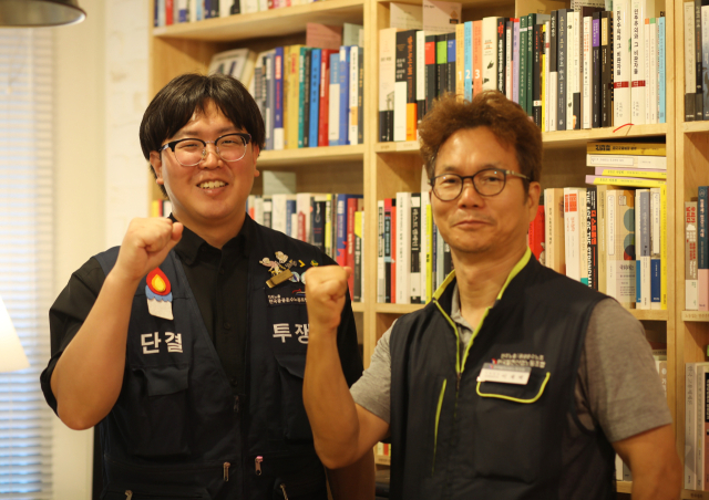 충남 태안화력발전소 노동자 이재백 씨와 김영훈 씨를 18일 서울 마포의 한 책방에서 만났다. 두 사람은 이날 에너지기후정책연구소·녹색연합·프레시안이 공동 주최한 '제1회 정의로운 전환 어워드' 수상을 위해 서울을 찾았다.