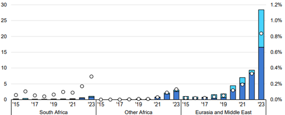남은 대륙은 이제 아프리카와 (중국을 제외한) 동남아시아 뿐이다. 아래 그래프의 왼쪽을 보면 아프리카는 후보군에서 확실히 배제할 수 있을 것 같다. 그런데 가장 오른쪽의 유라시아·중동 지역의 경우 점유율은 1% 미만이지만 판매량이 상승하는 기울기가 심상치 않다.