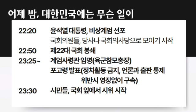 '3일 오후 10시 20분 윤 대통령의 비상계엄 선포, 10시 50분 22대 국회 봉쇄' 등으로 시작해 '4일 오전 1시 국회 비상계엄 해제 요구결의안 가결, 오전 4시 26분 윤 대통령 대국민 담화 시작, 오전 5시 4분 국무총리실, 국무회의에서 계엄해제안 의결 발표'로 끝맺는다.