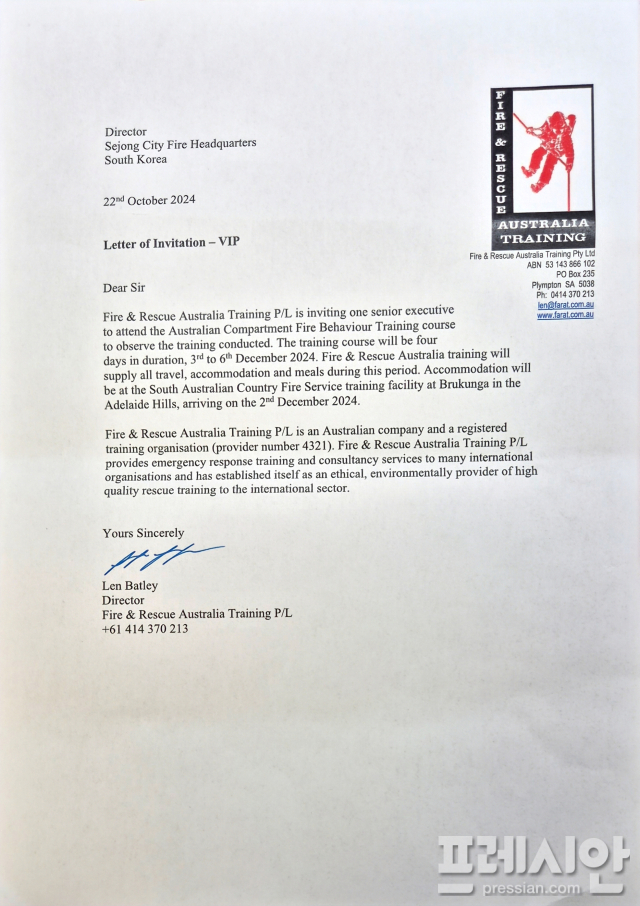 실화재교육기관인 호주 파랫은 지난 10월22일 세종소방본부에 VIP 초청장을 보내왔다,