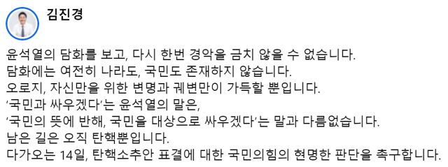 김 의장은 "‘국민과 싸우겠다’는 윤석열의 말은, ‘국민의 뜻에 반해, 국민을 대상으로 싸우겠다’는 말과 다름 없다"며 "남은 길은 오직 탄핵 뿐이다. 다가오는 14일, 탄핵소추안 표결에 대한 국민의힘의 현명한 판단을 촉구한다"고 덧붙였다.