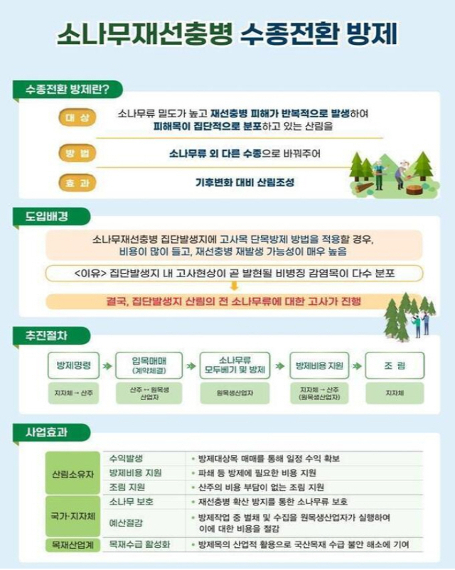 이번 사업은 산주와 원목 생산자 간 계약을 통해 진행되며, 산주는 적정한 나뭇값을 받고, 원목 생산자는 파쇄 비용(25,000원/㎥)을 보전받아 방제 예산 절감 효과를 기대할 수 있다. 또한 방제 이후에는 소나무류를 제외한 다양한 수종을 조림할 계획이다.