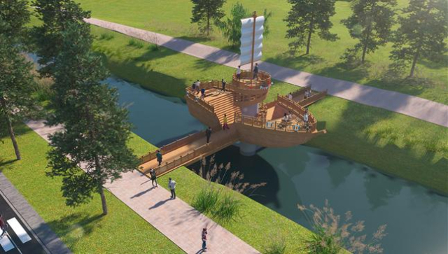 보행교는 신운천이 시작되는 초입부에 조성된 뱃머리 조형물을 모티브로 신운천을 따라 흘러가는 배를 형상화했으며 배 위에 설치된 돛에 조그마한 망루를 계획해 전망탑의 기능을 할 수 있도록 계획했다.