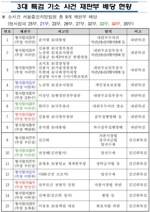 또 "김건희 특검이 기소한 사건은 현재 7건(김건희, 전성배, 이종호 등)인데, 형사합의 27부(우인성 부장)등 5개 재판부가 각각 담당하고 있다"며 "내란 우두머리- 주요임무종사자-부화수행자"를 한 재판부에서 집중 심리하고 '윤석열, 한덕수, 김용현, 이상민, 노상원, 조지호, 김봉식'을 한 재판부에서 재판해야 상식적"이라고 강조했다.