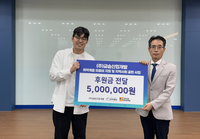 ㈜금송산업개발이 영경의료재단 전주병원 · (사)건강나눔영경후원회에 취약계층 의료비 지원 및 지역사회 공헌을 후원금 500만 원을 기탁하였다.