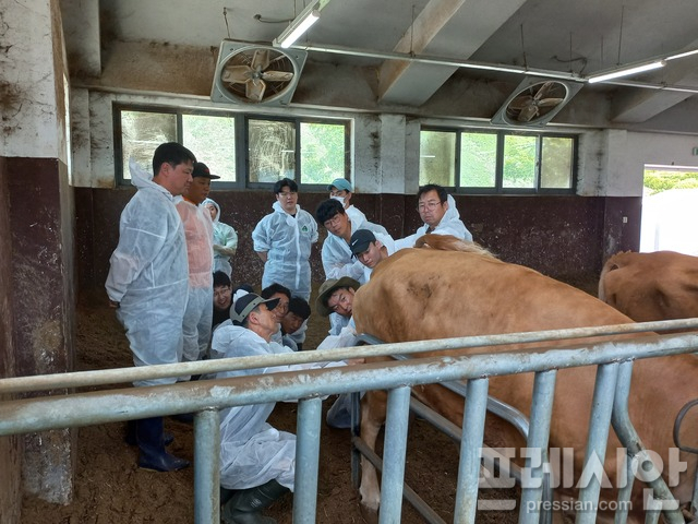 ▲전북도가 한우 개량사업의 일환으로 진행한 축산기술 전문교육 현장에서 교육생들이 현장 실습을 하고 있다. ⓒ전북특별자치도 축산연구소