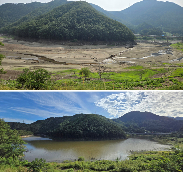 ▲강원 강릉지역 생활용수의 87%를 공급하는 상수원 오봉저수지의 8월 하순 최악의 가뭄 시기와 23일 오전 물이 가득한 모습이다. 11.5%까지 떨어졌던 오봉저수지는 최근 내린 비로 많은 물이 유입되면서 저수율 62.1%를 기록하고 있다. 앞서 행정안전부는 22일 지난달 30일 가뭄으로 강릉시에 선포했던 가뭄 재난사태를 24일 만인 오후 6시부로 해제했다. ⓒ연합뉴스
