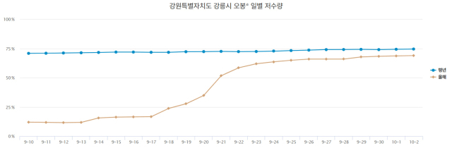 2일 기준, 강릉시 오봉저수지 저수율은 69.0%를 기록했다. 지난달 21일 51.8%로 저수율이 절반을 넘은 이래 꾸준히 증가했다. 저수율은 17~21일 동안 가장 높은 증가세를 보였다. 5일간 200mm(밀리미터)가 넘는 누적강수량이 강릉 전 지역에 내리면서, 저수율도 16.7%에서 51.8%로, 극적으로 회복됐다. 오봉저수지는 강릉시 생활용수의 약 87%를 공급하는 취수원이다.