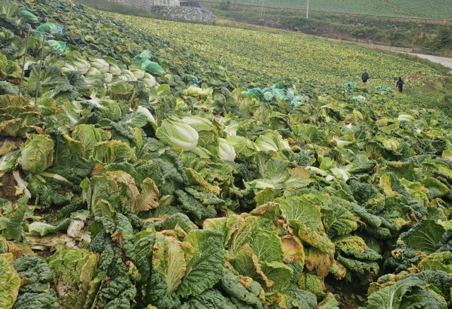 ▲추석 연휴 시작을 1주일여 앞둔 25일 강원 강릉시 왕산면 안반데기에서 농민들이 고랭지 배추를 수확하고 있다. 안반데기는 올해 극심한 가뭄과 폭염으로 작황이 매우 나빠 수확을 포기한 농가가 속출하고 있다. ⓒ연합뉴스