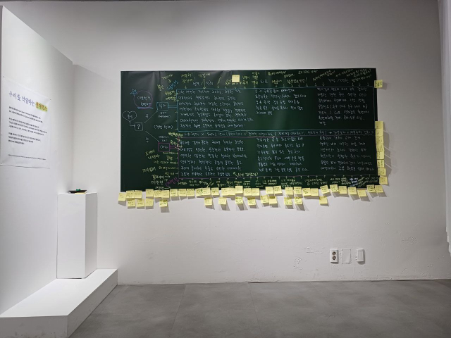 전시장을 들어서기 전, 유리벽에는 무지개빛 메시지들이 띠처럼 둘러져 있다. 201명의 피해 당사자들이 보낸 응원의 말들이었다. 화사는 <케이팝 데몬 헌터스>에서 악령을 막아주는 '혼문'을 떠올리며 '무지개 혼문'을 만들었다고 했다. 그것은 단순한 전시 입구 장치가 아니라, 상처를 지닌 사람들이 서로를 맞이하며 보듬는 돌봄의 문이었다. 전시장으로 들어서면 가장 먼저 전시의 취지를 알리는 글이 관람객을 맞이한다. 더 이상 침묵하지 않고 연대하여 목소리를 내겠다는 선언이었다.