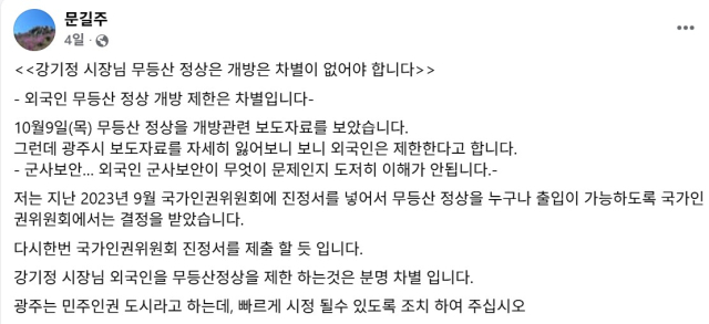 문씨는 진정서에서 "지난 2023년에도 같은 문제로 진정을 제기하자 당시 광주시는 '외국인 인권 문제를 충분히 인지하지 못했다'고 인정했다"며 "같은 해 9월부터는 국적과 관계없이 누구나 출입이 가능하도록 무등산을 개방키로 결정해 진정 사유가 해소된 바 있다"고 했다.