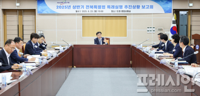 ▲김관영 전북도지사가 2025년 상반기 전북특별법 특례 실행 추진상황 보고회에서 관계자들과 추진 계획을 점검하고 있다. (2025.6.23) ⓒ전북도