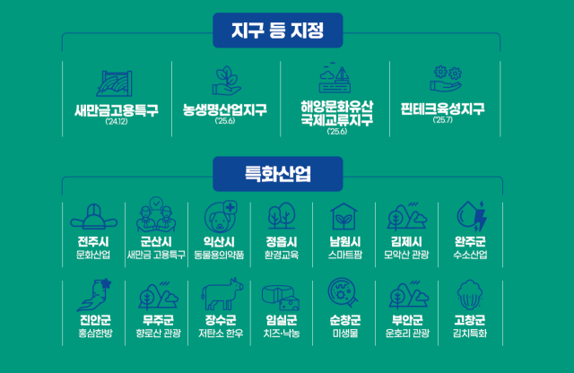▲전북특별자치도 14개 시·군의 대표 특례 현황. 문화·농생명·관광·첨단산업 등 지역별 전략이 추진되고 있다. ⓒ전북도