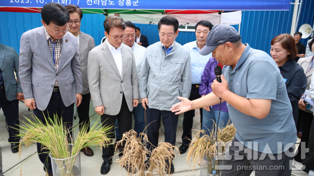 김민석 총리는 7일 오후 장흥군 안양면 해창리 일원의 벼 깨씨무늬병 피해 현장을 찾아 "벼 깨씨무늬병 피해가 농업재해로 인정받을 수 있도록 관계부처와 적극적으로 관심을 기울이겠다"고 밝혔다.