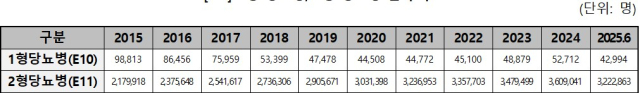 더불어민주당 박희승 의원(남원장수임실순창, 보건복지위)이 국민건강보험공단으로부터 제출받은 자료에 따르면 당뇨 환자는 2015년 252만 5,454명에서 2024년 397만 1,113명으로 10년 만에 57.2% 늘었다. 올해도 6월 기준, 355만 8,285명에 달해, 증가세가 가파르다.