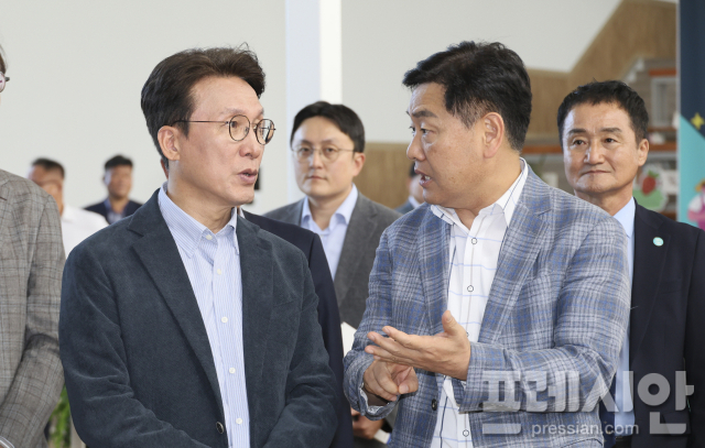 ▲김민석 국무총리가 8일 김제 스마트팜 혁신밸리를 방문해 김관영 전북도지사와 농업 혁신 정책과 청년 창업 지원 방향에 대해 의견을 나누고 있다. ⓒ전북도