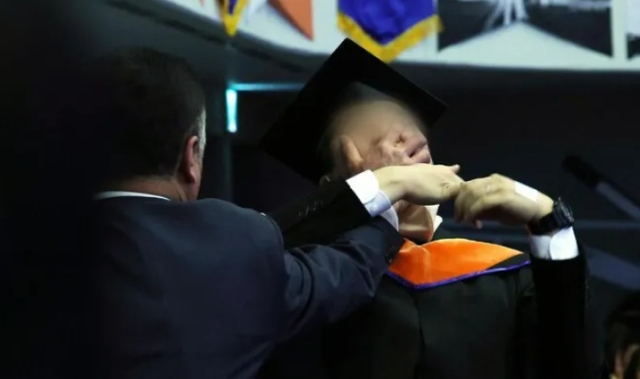 ▲ 대전 유성구 한국과학기술원(KAIST)에서 열린 2024년 학위수여식에서 한 졸업생이 윤석열 대통령이 축사를 할 때 알앤디(R&D) 예산과 관련해 자리에서 일어나 대통령을 향해 항의를 하던 중 제지를 당하고 있다. ⓒ연합뉴스